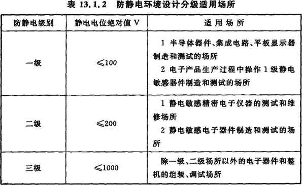 13.1.2 防靜電環(huán)境設(shè)計應(yīng)按電子產(chǎn)品或生產(chǎn)工序(設(shè)備)進行分級。防靜電環(huán)境內(nèi)靜電電位絕對值應(yīng)小于電子產(chǎn)品的靜電電位安全值。防靜電環(huán)境設(shè)計應(yīng)分為三級,防靜電環(huán)境設(shè)計分級適用場所應(yīng)符合表13.1.2的要求。