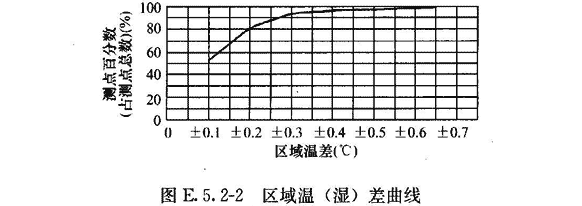 區(qū)域溫差、區(qū)域相對(duì)濕度差:按測(cè)點(diǎn)中最低或最高的一次測(cè)定值與各測(cè)點(diǎn)平均溫度和平均相對(duì)濕度的差值的測(cè)點(diǎn)數(shù),占測(cè)點(diǎn)總數(shù)的百分比,整理成累計(jì)統(tǒng)計(jì)曲線(xiàn)(圖E.5.2—2)。