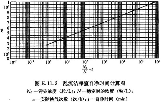 E.11.3 由測(cè)得的開(kāi)機(jī)前原始濃度或發(fā)煙停止后1min的污染濃度(N0)、室內(nèi)達(dá)到穩(wěn)定時(shí)的濃度(N)和實(shí)際換氣次數(shù)(n)查圖E.11.3,得到計(jì)算自?xún)魰r(shí)間,再和實(shí)測(cè)自?xún)魰r(shí)間進(jìn)行對(duì)比。