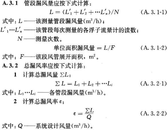 1 檢測前應(yīng)根據(jù)設(shè)計(jì)最大允許漏風(fēng)量選用合適的浮子流量計(jì),浮子流量計(jì)應(yīng)采用2個(gè)或2個(gè)以上并聯(lián),并采用相同規(guī)格的浮子流量計(jì),并聯(lián)浮子流量計(jì)的總測量范圍應(yīng)高于最大允許漏風(fēng)量20%。當(dāng)浮子流量計(jì)的讀數(shù)均為零時(shí),關(guān)掉一個(gè)浮子流量計(jì),如果其余浮子流量計(jì)的讀數(shù)仍為零,再關(guān)掉一個(gè)流量計(jì),直至只剩一個(gè)流量計(jì)仍為零時(shí),則認(rèn)為該管段合格,漏風(fēng)量的計(jì)算可按所用未關(guān)浮子流量計(jì)最小刻度的5倍計(jì)算。應(yīng)重復(fù)以上操作,測量的次數(shù)應(yīng)不少于2次。