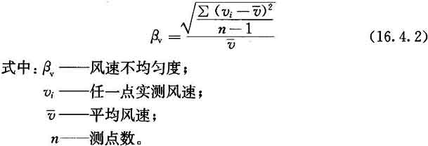 16.4.2 當需對室內單向流品質作細致確認時,可測工作區(qū)(或規(guī)定高度)截面風速不均勻度。風速不均勻度應按附錄E檢驗,并按下式計算,結果不應大于0.25。