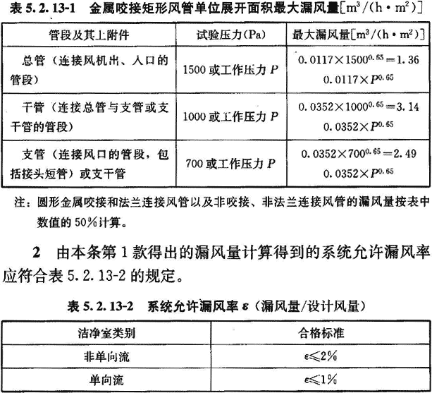 5.2.13 咬接和法蘭連接的金屬風(fēng)管,應(yīng)在膠封縫隙以后和絕熱之前,按附錄A的方法進(jìn)行分段漏風(fēng)檢測或按現(xiàn)行國家標(biāo)準(zhǔn)《通風(fēng)與空調(diào)工程施工質(zhì)量驗收規(guī)范》GB 50243的方法進(jìn)行干管和主管系統(tǒng)的漏風(fēng)檢測。1~5級潔凈度環(huán)境的風(fēng)管應(yīng)全部進(jìn)行漏風(fēng)檢測,6~9級潔凈度環(huán)境的風(fēng)管應(yīng)對30%的風(fēng)管并不少于1個系統(tǒng)進(jìn)行漏風(fēng)檢測。檢測結(jié)果應(yīng)同時符合下列兩項嚴(yán)密性指標(biāo):