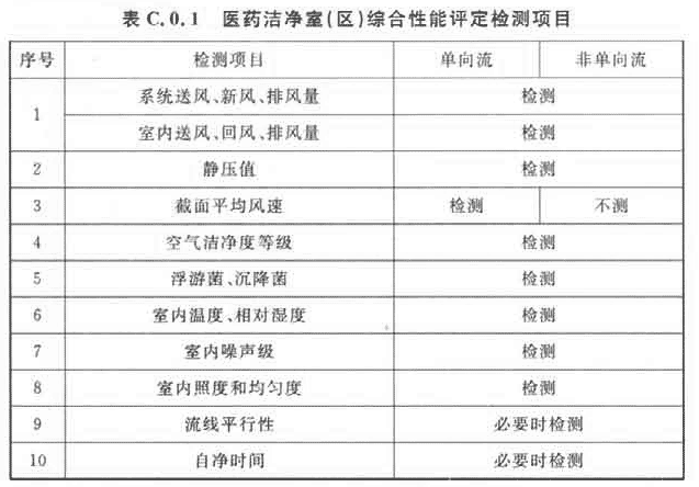 4 醫(yī)藥潔凈室(區(qū))的綜合性能確認(rèn),應(yīng)包括表C.0.1項(xiàng)目的檢測和評(píng)價(jià)。