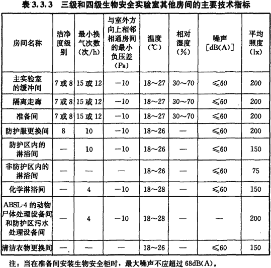 3.3.3 三級(jí)和四級(jí)生物安全實(shí)驗(yàn)室其他房間的主要技術(shù)指標(biāo)應(yīng)符合表3.3.3的規(guī)定。