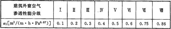 式中:α1——外門窗縫隙滲風(fēng)系數(shù)[m3/(m·h·pab)],當(dāng)無實測數(shù)據(jù)時,可根據(jù)建筑外窗空氣滲透性能分級的相關(guān)標(biāo)準(zhǔn),按表F.0.3采用;