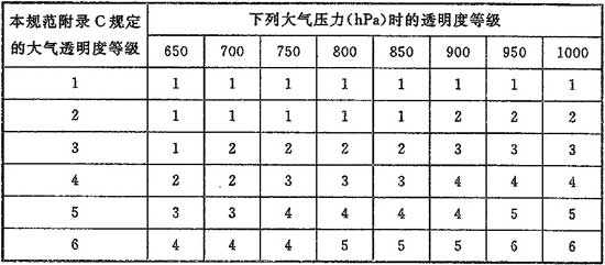 4.3.4 采用本規(guī)范附錄C和附錄D時(shí),當(dāng)?shù)氐拇髿馔该鞫鹊燃墤?yīng)根據(jù)本規(guī)范附錄E及夏季大氣壓力按表4.3.4確定。